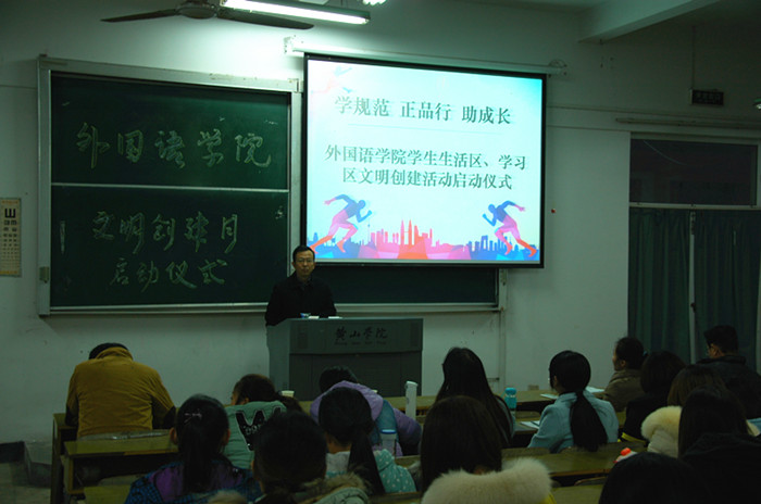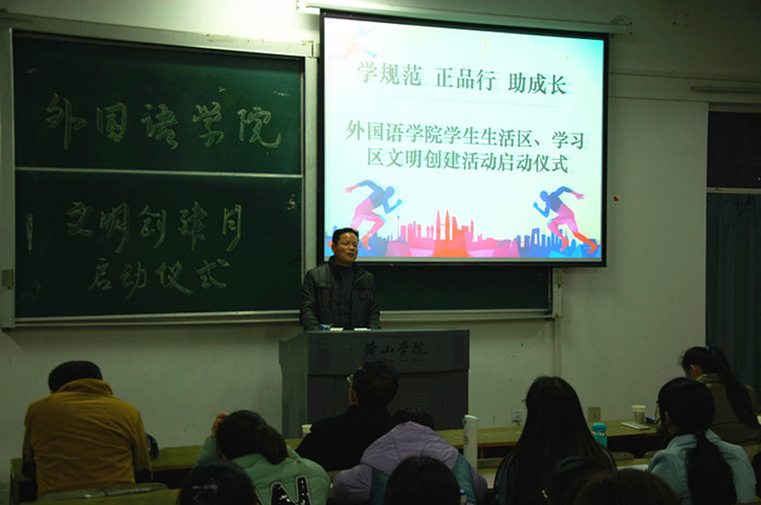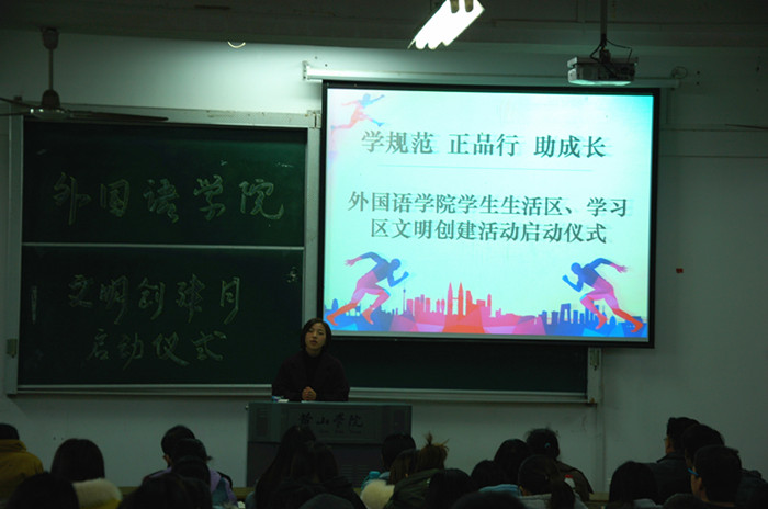 11月28日下午,beat365在线唯一官网在外语楼多媒体一教室举行“学生生活区、学习区”文明创建活动启动仪式。beat365在线唯一官网院长黄立华、党总支副书记王国平以及专兼职辅导员出席,各班班长、团支书、寝室长和部分学生代表参与了此次启动仪式。会议由院团总支负责人王琦主持。
