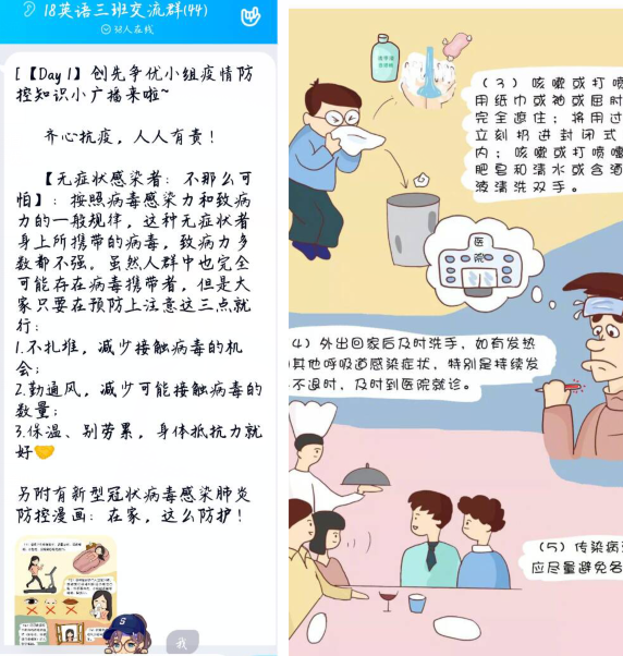 创先争优小组成员组织学生党员搜集、筛选和编写有关防控疫情方面的小知识,深入到学院的每个班级QQ群中,每日进行防疫宣传教育和健康提示,做好学生的贴心人。宣传内容精炼、实用且通俗易懂,涵盖疫情时讯、日常防护、学生就业资讯、公开课分享等。