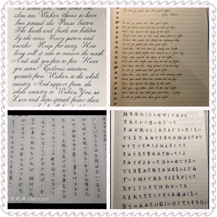 此次书法比赛分为英语和日语假名书法两组,历时两周左右。经评选后,17日语徐淑婷、18英语谢梦鲜、19英语王航荣获英文组一等奖;17英语余凡、18英语朱旭日、单福玲、18日语李越越、赵欣蕊、19英语刘瑶羽、秦贝贝、薛红燕荣获英文组二等奖;19英语邱雨露、19日语朱伟业等荣获英文组三等奖。朱旭日、李明月分获日文专业组、非专业组一等奖;赵玲玲、周子怡、祝薛、冯志敏分获日文专业组、非专业组二等奖;王心悦、华雨蒙、章丽云、李瑶瑶和阮晗、卢旭生、唐冰冰、黄志伦分获日文专业组、非专业组三等奖。活动准备前期,该学院精心准备活动策划,线上多方位宣传,明确分工、收集选手作品信息。各位参赛选手抄写一段英文或日文,体裁不限,参赛作品风格多样,或优美温柔或铿锵慷慨,但都能从文字的魅力中体现积极乐观的生活态度和文化素养。