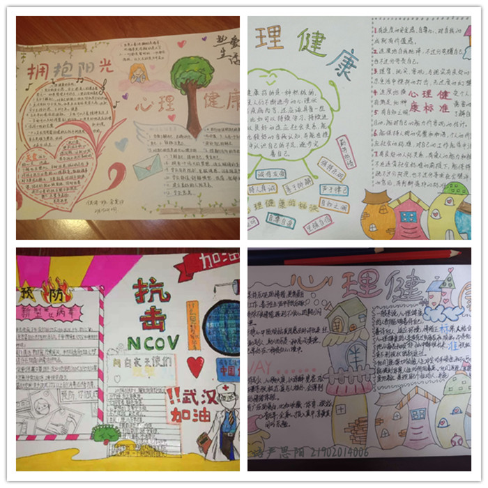 活动期间,大家利用课余时间查阅相关心理文献,精心编排设计,并融入发生在自己身边的心灵小故事,制作出一幅幅紧扣活动主题、新颖美观、图文并茂,极富创造力的心理健康手抄报。18英语三班佘赵存以抗击新型冠状病毒为主题,向我们展示疫情之下白衣天使不畏艰险的英雄气概。“病毒无情人有情,中国加油。”