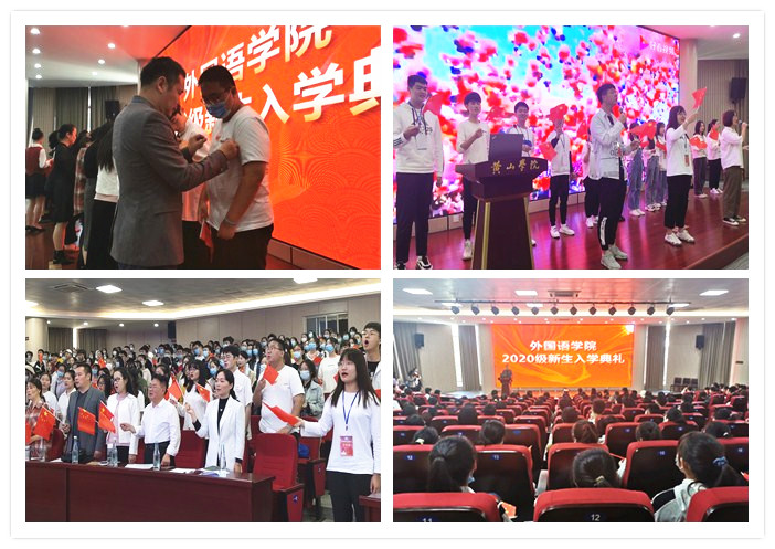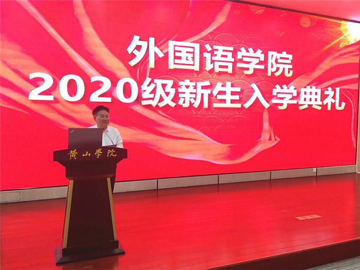 典礼伊始, 18日语班的王心悦作为老生代表发言。她勉励学弟学妹们在大学期间认真学习,踏实做好学生会、社团、班级工作,拥有积极乐观、实事求是的生活态度。19英语1班的刘东波作为新生代表发言表示,会牢记师友们的热切期盼,扬起理想之帆,不驰于空想,不鹜于虚声,以行动为先,去追寻星辰大海。洪常春介绍了2020级本科生的培养计划、学院本科教学特色及专业设置情况。学院教师为2020级新生代表佩戴校徽。