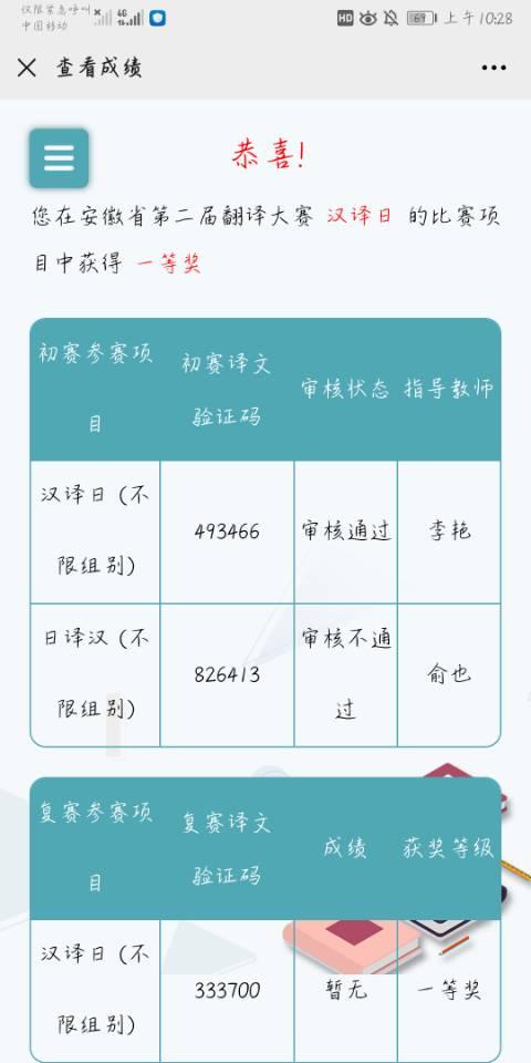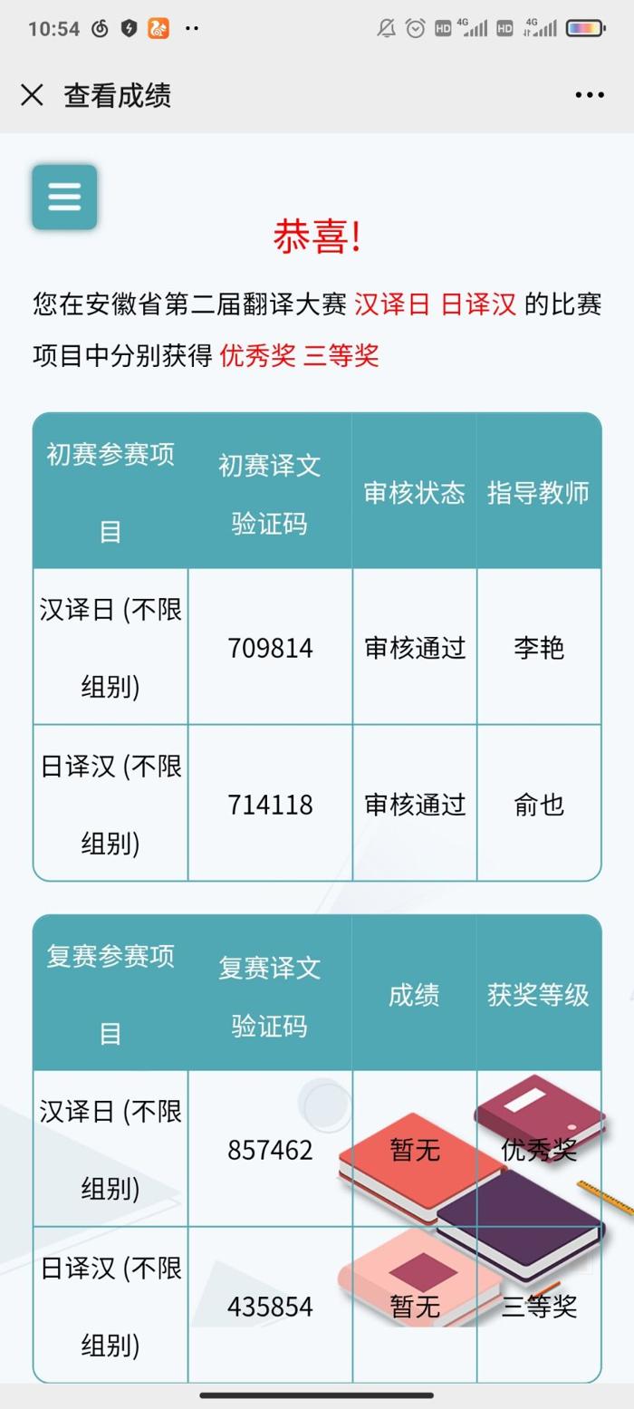 18日语班沈楠同学和王玉莹同学在汉译日组中脱颖而出,分获一等奖和优秀奖(指导教师:李艳);日译汉组中,18日语班王玉莹同学荣获三等奖(指导教师:俞也); 18级英语班张欣怡同学在英译汉组中荣获三等奖(指导教师:陈桂花)。