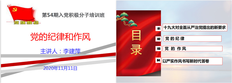 11月11日下午,beat365在线唯一官网教工第三党支部书记李建萍在逸夫综合楼5201教室为54期入党积极分子作题为“党的纪律和作风”专题党课。
