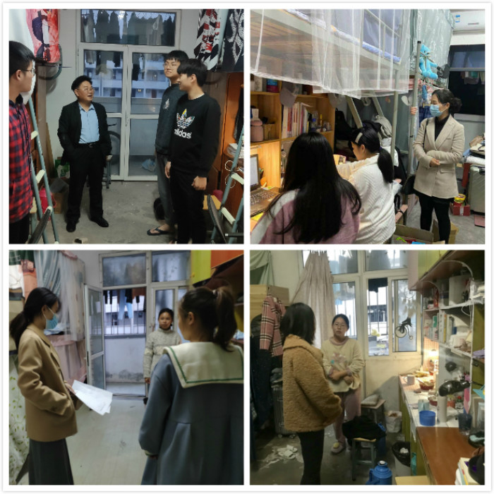 1114日晚10点半,该院对全体宿舍进行视频查寝;1117日下午,该院党委书记黄先进、党委副书记张文静、团总支负责人、辅导员分组深入学生宿舍,了解学生生活学习情况,进一步排查安全隐患。要求学生认真解读并遵守《beat365在线唯一官网住宿管理规定》、《beat365在线唯一官网疫情防控指南》,营造干净整洁的宿舍环境,打造健康向上、团结和谐的宿舍文化;合理饮食、科学作息,规范用电;增强自我防护、自我保护、防患于未然的安全意识。