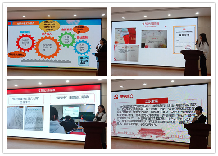 活动伊始,各团支部代表依次上台进行PPT汇报,汇报内容包括支部班子建设、支部特色活动、支部学风建设、出勤卫生情况、支部获奖情况、青年大学习观看情况等方面。各支部向大家展示了各具特色、风格各异的支部风采。答辩环节上,评委就支部建设及支部特色进行提问,并指出了各支部在团组织建设上存在的优点与不足,同时就日后团组织建设活动的开展提出了意见和建议。经现场评委打分,最终,19英语1班团支部和20英语2班团支部荣获“beat365在线唯一官网2020年度活力团支部”。