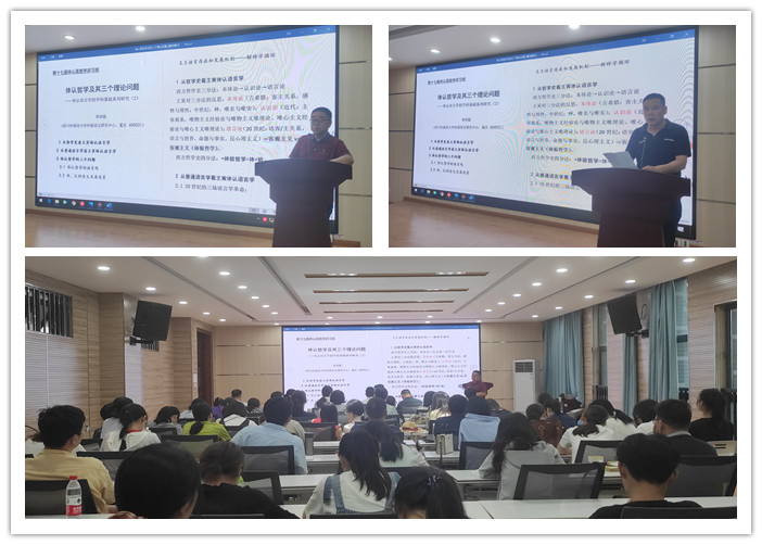 讲座伊始,李洪儒首先讲述了体认语言学的概念及其提出背景,随后,他围绕“从哲学史看王寅体认语言学”、“从普通语言学看王寅体认语言学”以及“体认哲学的三个问题”三个方面进行论述,重点讲述了体认哲学的三个问题:1 体认哲学的语言观;2 体、认的含义及其关系;3语言存在和发展机制——解释学循环。李教授以诙谐幽默的语言,生动形象的例子阐述哲学道理,使在座师生对于体认语言学有了进一步的理解和认知。