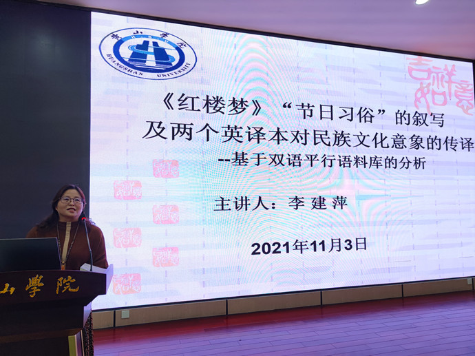 2021年11月3日下午3时,“行知讲坛”第142讲在文端楼二楼报告厅举行。beat365在线唯一官网李建萍副教授作题为《〈红楼梦〉“节日习俗”的叙写及两个英译本对民族文化意象的传译——基于双语平行语料库的分析》的讲座。beat365在线唯一官网近200名师生参加此次活动,讲座由该院副院长王任傅主持。