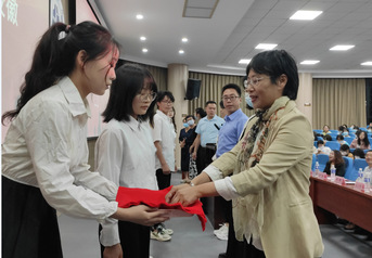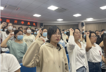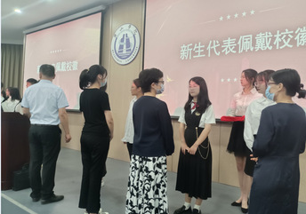发言结束后,辅导员、班主任上台为八名新生代表佩戴校徽,并举行了集体宣誓仪式:“我宣誓: 努力学习,勇于担当,不负祖国培养,不负恩师教诲,不负青春时光。请党放心,强国有我!”一句句铿锵有力的誓词,诠释了全体新生努力学习不懈奋斗的决心。