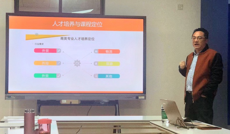 王斌以《行业需求与商务英语专业定位》为题,介绍了外贸发展的三个阶段,分析了互联网时代外贸岗位的需求,详细解读了外贸岗位职责,细致阐述了人才培养与课程定位的关系。他建议,一要抓好课程教学改革,推动英语课程充分融入商务课程;二要创新教学内容,确保教育教学契合市场需求;三要抓好实践教学环节,通过有力有效的课程实训培养学生实践能力。王斌还就商务英语方向的人才培养定位、课程设置、教师发展等问题与大家进行了深入的探讨与交流。