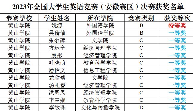 近日,2023年全国大学生英语竞赛(安徽赛区)落下帷幕。beat3652021级英语专业姚源荣获特等奖,并进入全国总决赛;朱梦萍等11名同学获一等奖;徐兰兰等62名学生获二等奖;章心雨等102名同学荣三等奖。全省共有70多所高校参加本次比赛。beat365学子在竞争激烈的比赛中斩获佳绩,展现了较高的英语运用能力和综合素质,体现了beat365外语教育教学改革成效。