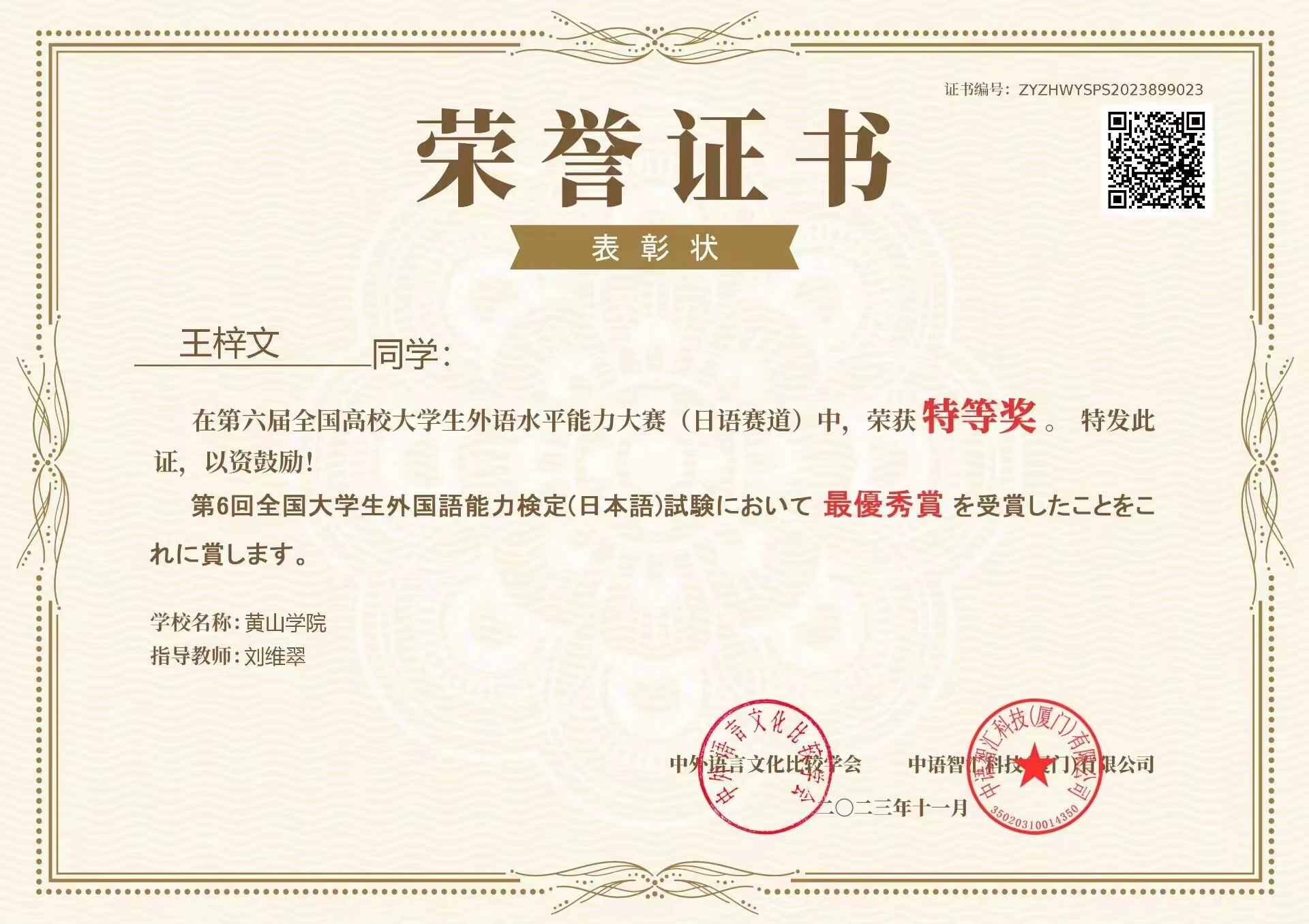 本次比赛由中外语言文化比较学会主办,中语智汇科技(厦门)有限公司承办。初赛、决赛均通过登录官方指定的平台进行参赛,比赛成绩由平台大数据分析并自动产生排名。此次共有来自日语专业、日语辅修专业和大学日语学生共52位同学参加校内初选赛。最终来自beat365在线唯一官网21日语1班赵湘琳同学、吴逸飞同学、21日语2班康倩影同学、21日语辅修班霍然同学和22日语1班的王梓文、22日语2班李超同学在校内选拔赛中胜出并代表beat365在线唯一官网参加决赛,并在决赛中表现出色,全部获奖。