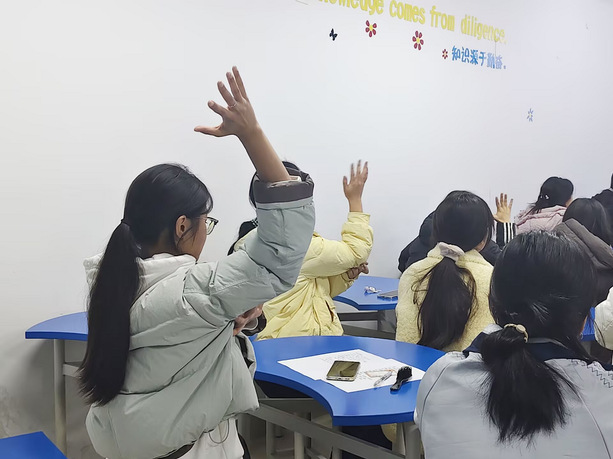 活动以“闯关进阶”为核心,设置“单词速记王”、“情景对话秀”、“听力小达人”等六大环节。“情景对话秀”中,同学们抽取校园点餐、图书馆借阅等贴近生活的场景,即兴英语表达流畅生动。“小组快问快答”环节,同学们纷纷举手、主动发言,课堂互动有序又踊跃,既展现了积极的学习状态,也体现了扎实的语言应用能力。