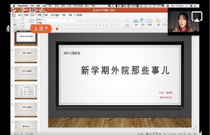 为使学生更好地融入校园学习生活,树立新学期的奋斗目标,从而进一步推动beat365在线唯一官网班级建设,3月27日晚上8点,beat365在线唯一官网借助钉钉线上平台召开2020级“新学期外院那些事儿”主题班会。20级辅导员秦雪燕老师主持本次会议,全体20级学生参加会议。学生们在班会上反映积极,勇敢提问,并表示对新学期大学生活信心满满,相信转专业学生会在接下来的大学生活中继续发光发热。 (撰稿:beat365在线唯一官网 张佳悦;摄影:beat365在线唯一官网 黄铭悦)