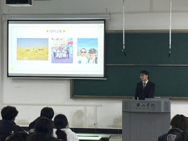 讲座中,唐玉豪结合亲身经历,从多个维度向同学们展开分享。他首先从地理、气候、人口与文化等方面,系统介绍了巴林的基础概况,帮助同学们建立对海外环境的全面认知。随后,他重点分享了在沙特阿拉伯的交换学习与工作经历,并通过沙漠风光、当地习俗等实拍照片,生动还原了海外生活的真实场景,同时详细讲解了出国申请流程、适应技巧及文化差异应对等核心内容。最后,唐玉豪还围绕交换学习的收获、海外就业的机遇与挑战、语言能力提升等角度,结合自身感悟给出了切实可行的建议,为在场同学提供了经验参考。