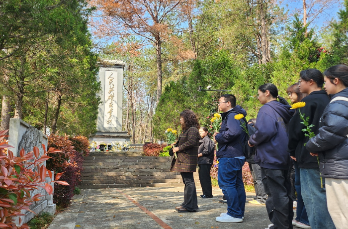 当日下午,全体人员在陵园入口处整齐列队,沿石阶缓缓而上。沿途设置的黄山革命故事碑群,以文字和浮雕再现了本土革命先辈为民族独立与人民解放浴血奋战的壮烈历程。师生们不时驻足细读,在一段段可歌可泣的史实中感悟信仰的力量。在庄严肃穆的“人民英雄永垂不朽”纪念碑前,全体人员脱帽默哀,向长眠于此的革命先烈致以深切哀悼。默哀毕,师生依次缓步上前,向纪念碑敬献菊花,以洁白的花朵寄寓哀思。随后,大家环绕碑座,仔细研读镌刻其上的各区县革命烈士英名与事迹,进一步加深对家乡红色历史的认知。