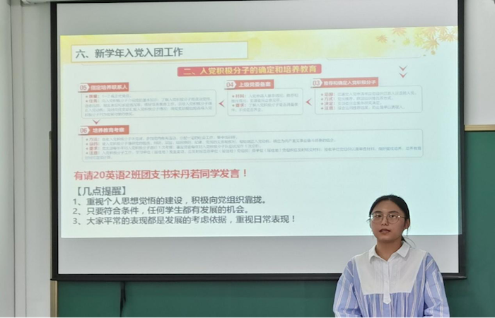 为确保此次班会的顺利举行,20英语2班班长谢志豪先行完成班会PPT制作并积极对班会召开做准备,本次20英语2班大二新学年第一次班会也是班级积极打造“推门听会”制度的重要实践形式,邀请更多的班长和老师参与到班级中,共同实现学院各班级的发展进步,始终是20英语2班不懈的追求。