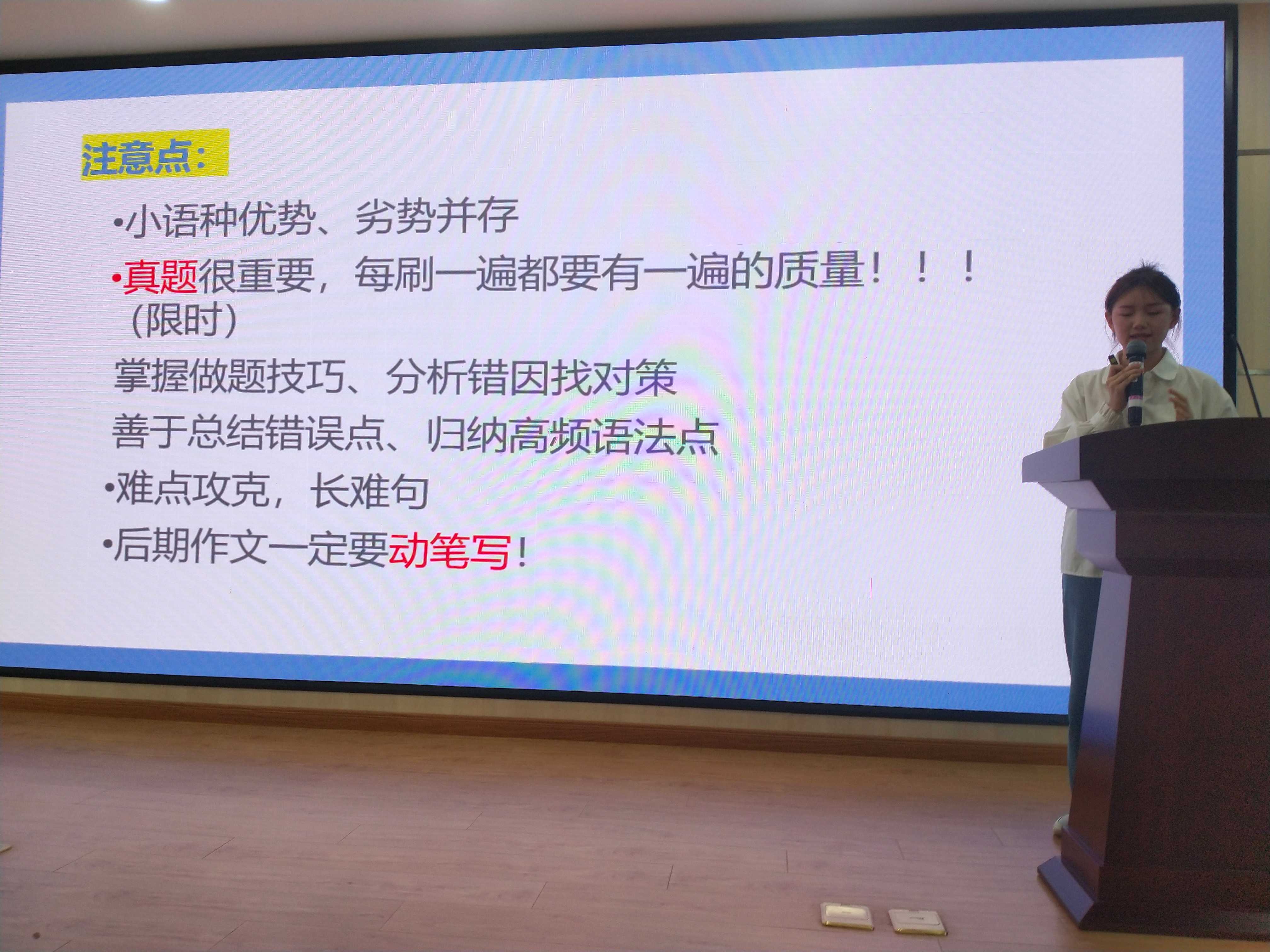 5月5日下午,beat365在线唯一官网教工第三党支部和院团委联合举办考研分享会,助力青年学子学习、成长、成才。此次活动邀请了文学院2018级汉语国际教育专业董晓璐同学来院分享考研经验,该生参加了2022年研究生招生入学考试,已被大连外国语大学汉语国际教育专业录取为硕士研究生。beat365在线唯一官网副院长王任傅出席分享会,该院相关专业学生参加分享会。分享会由beat365在线唯一官网教工第三党支部书记李建萍主持。