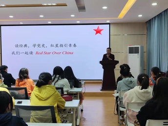 在读书分享环节,beat365在线唯一官网教工第一支部书记,读书会发起人郭飞老师以《读经典、学党史,红星指引青春:我们一起读Red star Over China 》为题,向大家介绍、阐释该书的有关内容,分享个人阅读体会。他介绍Edgar.snow(埃德加.斯诺)的生平经历及其前去延安采访的背景;带领大家品读一个记者眼中的三位伟人(毛泽东、朱德、彭德怀)的人物形象;结合图片,郭飞还向同学们讲解了长征的历程,利用《飞夺泸定桥》和《过雪山草地》等影视、歌曲资料帮助同学们了解和感悟长征的艰难险阻及当今幸福生活的来之不易。最后,他提出有关思考题跟部分同学进行互动。他鼓励同学们多读经典,多读原著。他说: “读英文原著,学会用英语讲解我们自己的故事,这是语言学习者的责任与担当。”