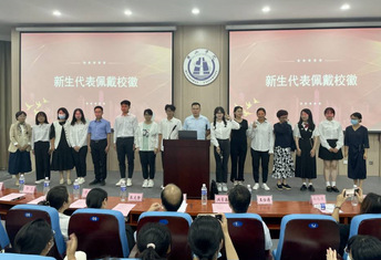 发言结束后,辅导员、班主任上台为八名新生代表佩戴校徽,并举行了集体宣誓仪式:“我宣誓: 努力学习,勇于担当,不负祖国培养,不负恩师教诲,不负青春时光。请党放心,强国有我!”一句句铿锵有力的誓词,诠释了全体新生努力学习不懈奋斗的决心。