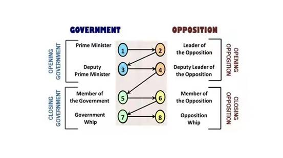 辩论形式采用“外研社·国才杯”全国大学生英语辩论赛赛制,即英国议会制辩论。辩题赛前保密。比赛中,两名选手组成一支队伍,四支队伍同场比赛,来自四支队伍的八名选手交替完成7分钟发言。四支队伍分别为:正方一队(Opening Government)、反方一队(Opening Opposition)、正方二队(Closing Government)、反方二队(Closing Opposition),发言顺序见下图。每位选手发言的首尾一分钟,可由对方辩手提出质询(POI)。