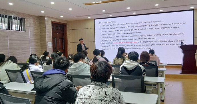 读书会上,黄先进巧妙设置问题,引导学生总结回顾自我的语言学习方法;他详细介绍并阐释学习策略的概念、特征、分类等;结合英语学习的特点,黄先进着重分析了复述、精细加工等具体的方法。谈到元认知、资源管理策略时,黄先进指出,在具体语言学习实践中,要有计划和具体的学习目标,对已有的学习材料要进行分析;学习过程中,要有良好的时间管理方法,对环境及自我努力程度也要进行管理。