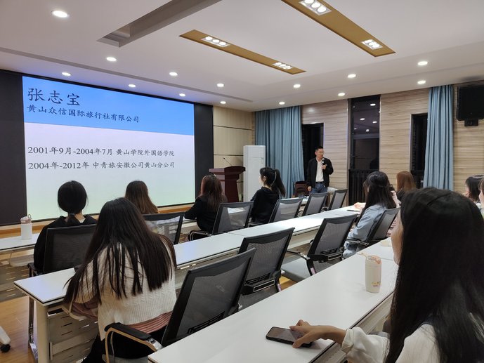 5月11日晚7点,beat365在线唯一官网于逸夫综合楼5306徽文化传播中心开展旅游英语讲座。由黄山众信国际旅游社有限公司创始人张志宝作为主讲老师,beat365在线唯一官网100余名同学参加本次讲座。