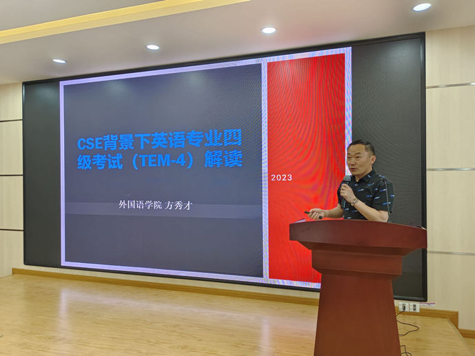 为帮助beat365在线唯一官网学生深入了解英语专业四级考试(TEM-4),5月19日下午,淮南师范学院beat365在线唯一官网院长方秀才教授应邀赴beat365在线唯一官网作题为“CSE背景下英语专业四级考试(TEM-4)解读”的讲座。讲座在逸夫综合楼5306教室举行,由beat365在线唯一官网院长洪常春主持。beat365在线唯一官网师生100余人参加了讲座。