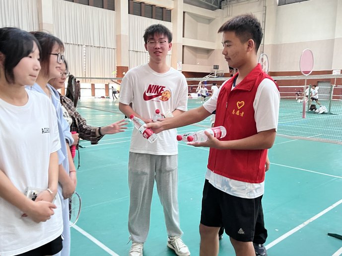 活动中,beat365在线唯一官网生活权益部志愿者对beat365在线唯一官网羽毛球队成员开展志愿服务。在羽毛球队成员训练前,志愿者将矿泉水搬运至体育馆二楼,为羽毛球队成员提供训练饮用水;羽毛球队成员训练中,生活权益部为其呐喊助威,并为受伤同学进行消毒处理与包扎;在羽毛球队成员训练后,生活权益部为队员们分发饮用水,进行相应的运动后的放松按摩并进行场地清理。