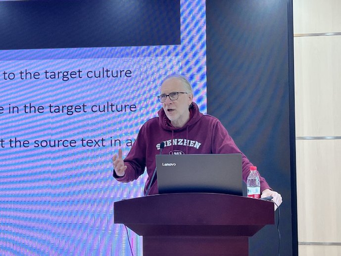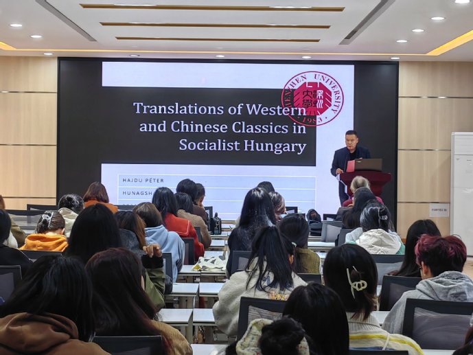 11月24日下午,beat365在线唯一官网邀请的匈牙利科学院文学研究所学术顾问、国际比较文学研究权威期刊Neohelicon主编彼得·海居(Péter Hajdu)教授于逸夫综合楼5306教室进行主题为“Translations of Western and Chinese Classics in Socialist Hungary”的英语讲座。beat365在线唯一官网院长洪常春主持了讲座,学院师生100余人参加了本次讲座。