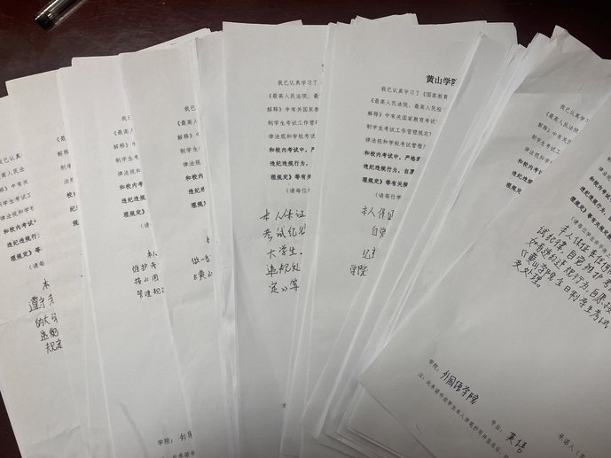 为进一步加强学生诚信意识,将诚信考试落到实处,确保将考试相关纪律要求传达给每一名同学,坚决抵制作弊行为,各班级辅导员组织学生签署诚信考试承诺书,要求同学们谨记承诺内容,杜绝侥幸心理,自觉抵制作弊行为,激发学生学习动力。