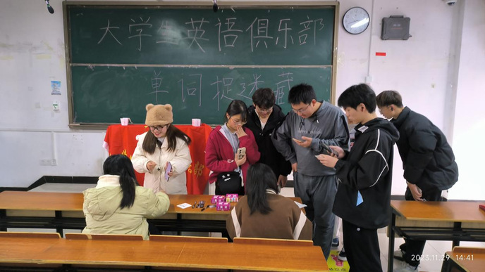 为更好地激发大学生们的英语学习热情,大学生英语俱乐部于11月29日分别在率水校区文端楼和横江校区一教楼1102教室开展了一场别开生面的“单词捉迷藏”活动。此次活动吸引了共153名同学积极参与,以寓教于乐的方式锻炼他们拼词造句、语言表达和逻辑思维能力。