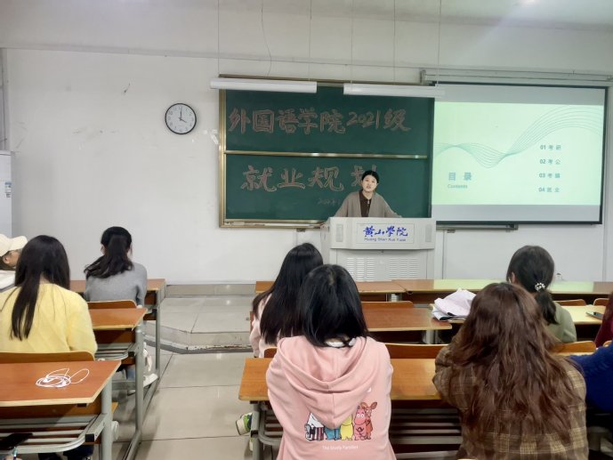 解方婷向同学们介绍了目前外语专业的就业情况和发展前景, 根据当前就业形势将本次班会内容分为考研、考编、考公、就业信息四个板块,并就三支一扶、西部计划、特岗教师等相关内容进行了详细讲解。