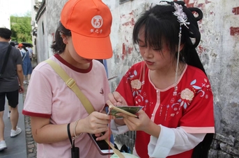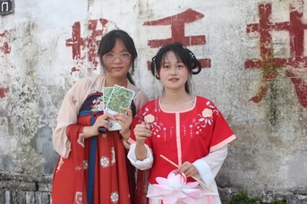 活动开始前,解方婷带领实践服务团成员进行实地考察并根据仁里景区地图制作具有仁里景区特色的明信片和印章,确定打卡点。实践服务团成员们迎着晨光穿着汉服,带着充满仁里气息的明信片前往仁里景区。汉服游园打卡活动共六个打卡点,每个打卡点对应一个印章(仁、义、礼、智、信、仁里),集齐六枚印章即可兑换由实践服务团成员们精心准备的小礼品,礼品摊放有制作好的调查问卷用于收集游客们对仁里景区的反馈和建议。