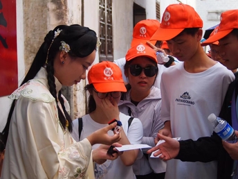 早上8点,实践服务团成员们在各打卡点准备就绪,“幸运游戏摊”摆放完毕,活动正式开始。前来游玩和研学的游客们一下车便被汉服游园打卡活动吸引,活动现场十分火爆。游客们带着明信片前往景区内打卡,在游览的同时又收获了新奇和喜悦,不少游客还和身着汉服的实践服务团成员们合影留念,活动获得一致好评。