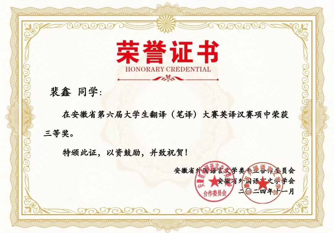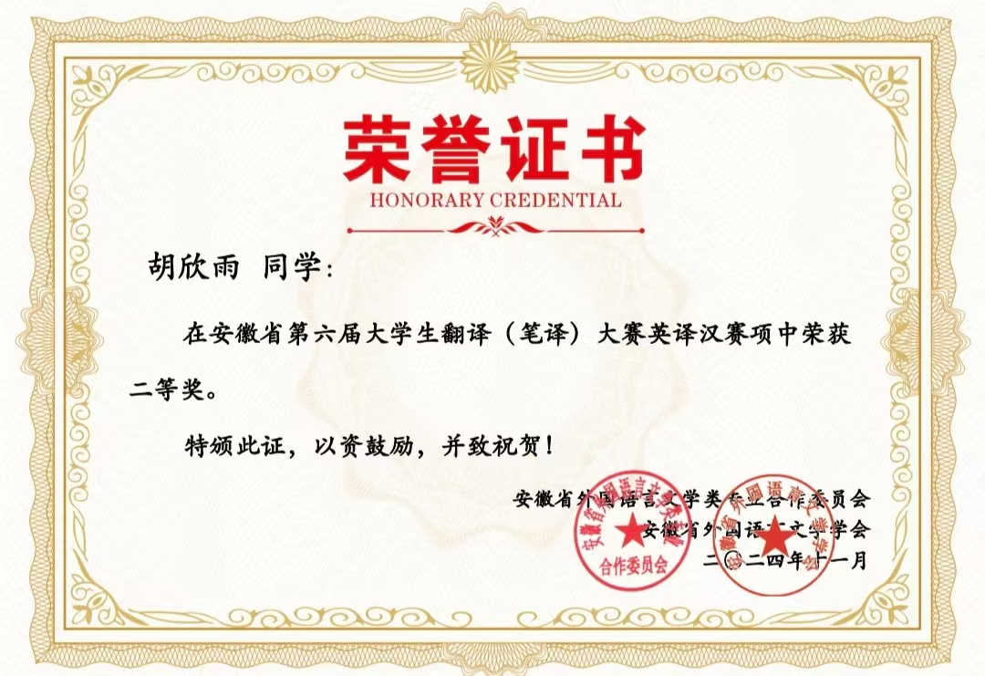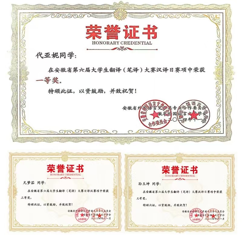 11月16日-17日,安徽省第六届大学生翻译(笔译)大赛决赛在阜阳师范大学举行。beat365在线唯一官网五名学子在此次比赛中荣获佳绩,在汉译日赛项中,21日语1班代亚妮(李艳指导)获一等奖,22日语2班孙玉坤(张亚璐指导)获三等奖;在日译汉赛项中,23日语1班凡梦茹(李艳指导)获三等奖;在英译汉赛项中,胡欣雨同学荣获二等奖,裴鑫同学在英译汉比赛中获三等奖,指导教师均为童兆升。童兆升、李艳、张亚璐获“优秀指导教师奖”。