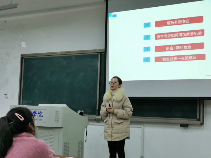 为使学生深入了解外语+商业复合这一发展趋势,推动外语专业学生向复合型人才方向发展,12月7日晚,beat365在线唯一官网于文渊楼1305教室举办了“外语专业如何C位出道”讲座,上海对外经贸大学优秀毕业生刘王丽老师做主讲人,20级辅导员及20级英语专业新生参加讲座。